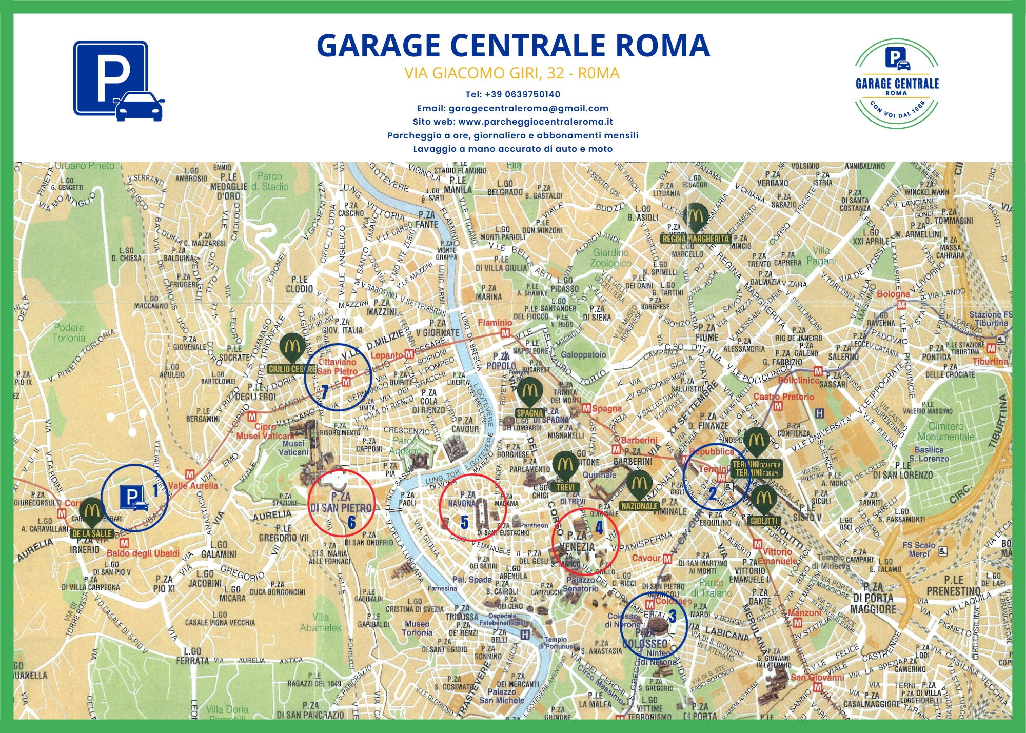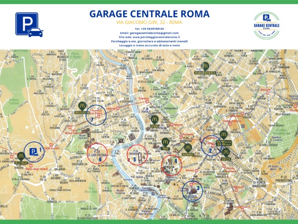 Offriamo una mappa gratuita cartacea tradotta in italiano e in inglese, con il percorso consigliato per visitare Roma in un giorno dal Garage.